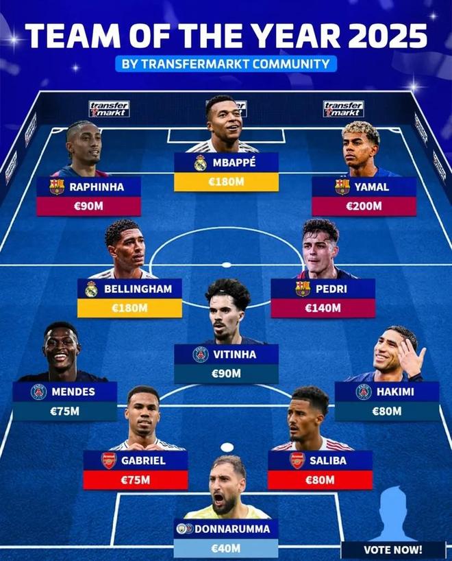 北京时间12月6日,德转通过用户投票评出2025年的最佳阵容,姆巴佩和亚马尔领衔,巴塞罗那和巴黎圣日耳曼各有3名球员入选,皇家马德里和阿森纳2人入围。